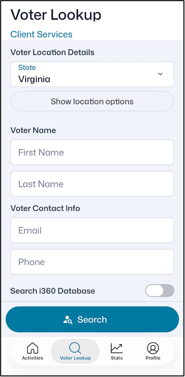 Voter Lookup is a volunteer permission available in the sidebar of the i360 Grassroots app. Volunteers can use it to search for individuals to apply tags and add notes to contact profiles.