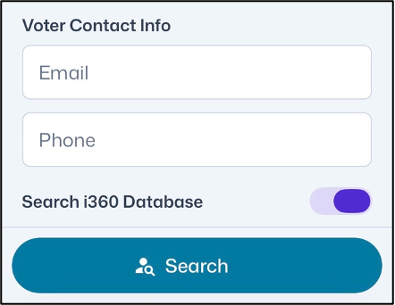 1. Select the state and fill in any known data to search for voters including First Name and Last Name. To add additional fields (including modeled affinity, voting districts, precinct, county) scroll down and toggle Search i360 Database to 'ON'.