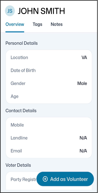 3. You can choose to add the voter as a volunteer. You may also add any relevant tags. Changes will save once you select ‘Add as a Volunteer’.